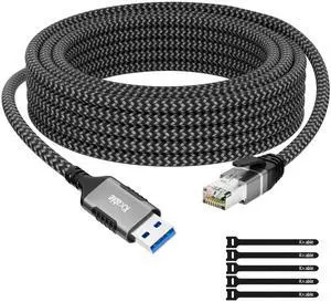 USB to Ethernet Cable 12 FT, USB 3.0 A Male to RJ45 Male Cord, Directly Connected, Aluminum Portable Gigabit LAN Network Cable for Laptop, PC, Switch, More, Braided with 5 Pcs Ties