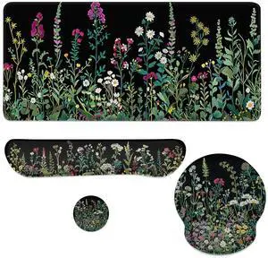 Wildflower Embroidery Mouse Pad Set Colorful Botanical Floral Gaming Mousepad 4in1 Desk Mat for Desktop Anti-Slip XXL Big Computer Ergonomic Mousepad with Wrist Support for Keyboard and Mouse