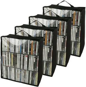 QTLCOHD 4 Pack DVD Storage Bags, Clear Media Organizer Holder with Handle and Zipper, Black, Holds Up 70 DVDs, 90 Blu-ray Cases, 120 CDs (Each)