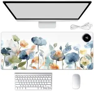 Heated Mouse Pad Hand Warmer, Warm Desk Pad Mousepad Desk Mat with 3 Levels Heating and Auto Shut Down 31.5 x 13 inch PU Leather Warmer Keyboard Mat for Gaming Laptop Office Home, Watercolor Flower