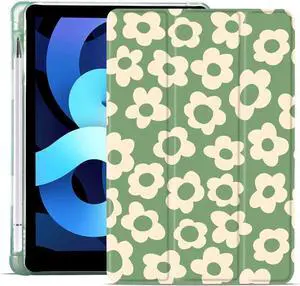 MAYCARI Green Flower Case for iPad air 10.9 inch 2020/2022 with Pencil Holder, Cute iPad 4th/5th Generation Protective Case with Soft TPU Green, Auto Sleep/Wake Cover Slim Shell for Girls Women