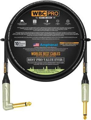 12 Foot - WBC-PRO-Guitar 20 AWG - Low-Cap (18pF/ft) Pro-Grade Graphite-Based - Dual-Shielded Guitar, Bass, Instrument Cable with Neutrik Angled to Angled Inch (6.35mm) Gold TS Connectors