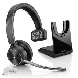 Poly Voyager 4310 UC Wireless Bluetooth Headset (USB-A) with Charging Headset Stand Bundle - Noise Cancelling Mic, Works with USB Deskphone, PC, Mobile, For Zoom and Phone Calls, GTW Microfiber Cloth