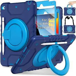 Andnary Case for iPad 9th/8th/7th Generation 10.2 inch, Shockproof Cover with Screen Protector/360 Rotating Handle/Bracket/Pen Holder/Shoulder Strap, Kids Case for iPad 2021/2020/2019 (Navy+Blue)