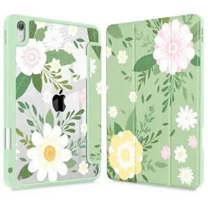 Tuiklol Case for iPad Air 13 (M3 2025 / M2 2024), Buit in Pencil Holder with TPU Protection Shockproof Cover Clear Transparent Back Trifold Stand-Auto Wake/Sleep Tablet Case, Flowers Green