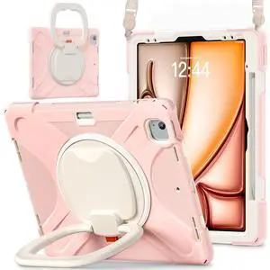 Batianda Case for iPad Air 13 inch 2025 M3 2024 M2 Chip Heavy Duty Rugged Durability Silicone Tablet Cover with 360 Rotating Ring Foldable Kickstand & Shoulder Strap, Pink