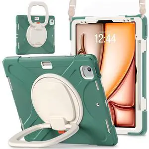 Batianda Case for iPad Air 13 inch 2025 M3 2024 M2 Chip Heavy Duty Rugged Durability Silicone Tablet Cover with 360 Rotating Ring Foldable Kickstand & Shoulder Strap, Sea Green