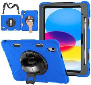 TNP Protective Case for iPad 10.9 Inch 10th Generation 2022 - Shockproof Cover Case with Pencil Holder, Rotating Handle, Adjustable Stand & Shoulder Strap (Model: A2696, A2757, A2777), Blue