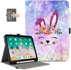 for iPad (A16) Case 11th Generation, iPad 10th Generation Case Pencil Holder Women Girls Kids Multi-Angle Adjustable Stand Shockproof Padding Pocket/Hand Strap/Auto Wake Sleep, Galaxy Purple Bunny