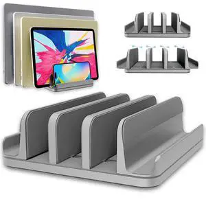 TEFONIA Vertical Laptop Stand Holder 5 Slots, Aluminum Space-Saving Laptop Holder, Adjustable Size Dock Tabletop Desk Organizer 3 Slot + 2 for Apple MacBook/Surface/PC/Tablet/iPad/iPhone (Space Gray)