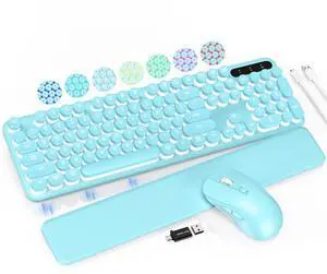 Wireless Keyboard and Mouse Backlit - Typewriter Keyboard with Retro Round Keycaps, Detachable Wrist Rest, Light Up Letters, 2.4G Rechargeable Combo for Mac, Windows, PC, Laptop, Trueque (Aqua Blue)