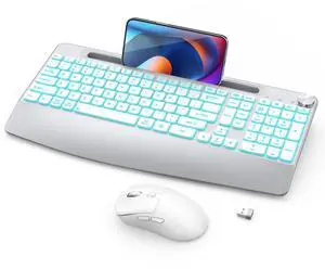 GAMCATZ Wireless Keyboard and Mouse Backlits - Full-Sized Ergonomic Lighted Keyboard with Wrist Rest, Phone Holder,2.4GHz Rechargeable Silent Keyboard Mouse Combo for Computer, Laptop, PC, Mac -White