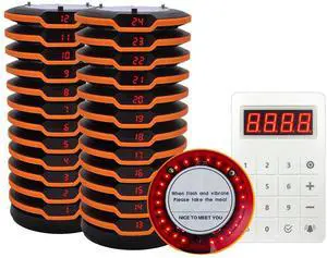Restaurant Pager System, Buzzers for Restaurants 24 Coaster Pagers with Rubber Protection, Touch Keyboard Transmitter,2 Charging Base, Buzzer System for Food Truck Church Nursery Coffee Shop
