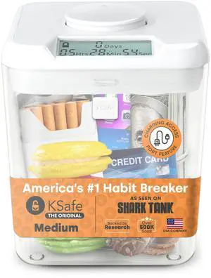kSafe Time Locking Container Medium Phone Lock Box, Snack Safe, Self-Control Timer Box, BPA-Free Plastic, No Overrides, 5.5 W x 5.5 H, White Lid, Clear Base