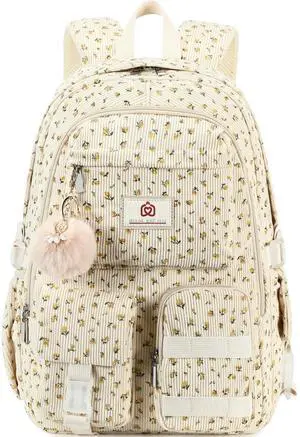 Hidds School Backpack for Teens Girls Women 15.6 Inch Laptop College Backpacks Corduroy Work Bag Kids Elementary Middle High Campus Bookbag Students Anti Theft Travel Daypack Womens - Beige Floral