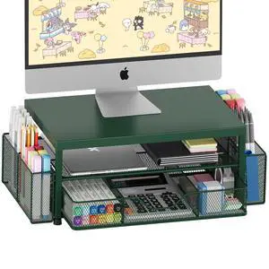 OPNICE Desk Organizers and Accessories, 2-Tier Computer Monitor Stand Riser with Drawer and 2 Pen Holders, Laptop Stand, Office Desk Accessories for Office Supplies, Dark Green