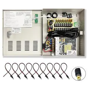 9 Port High Power Security CCTV Camera Access Control Power Distribution Box 12V DC 10 Amp PTC Protection, with 9 Pcs. DC Male Pigtail