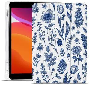 MAYCARI Retro Blue Flowers Case for iPad 10.2 inch 2021/2020/2019 with Pencil Holder, Original Pattern iPad 9th/8th/7th Generation Soft TPU Back Protective Cover Shell, Auto Sleep/Wake Slim Shell