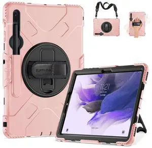 SUPFIVES Case for Samsung Galaxy Tab S7 FE 12.4 Inch 2021 : [Upgraded Military Grade] Full-Body Rugged Protective Soft Silicone Cover - Kick Stand- Handle/Shoulder Strap- S Pen Holder- Pink