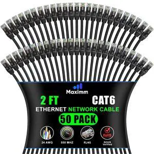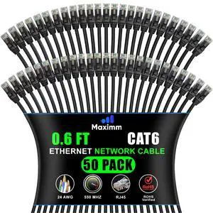 Maximm Cat 6 Ethernet Cable 0.6 ft (50-Pack) - High-Speed LAN Cable, Internet Cable, Patch Cable, and Network Cable - UTP, 10Gbps, 550MHz Ethernet Cord - Black