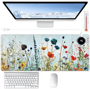 Heated Desk Pad Large Mouse Pad 31.5 x 13 inch with 3 Levels Heating & Auto Shut-Off Warm Mouse pad PU Leather Computer Mousepad for Home Office Work - Watercolor Colorful Flowers
