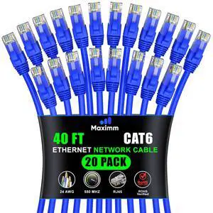 Maximm Cat 6 Ethernet Cable 40 ft (20-Pack) - High-Speed LAN Cable, Internet Cable, Patch Cable, and Network Cable - UTP, 10Gbps, 550MHz Ethernet Cord - Blue