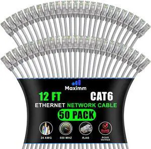 Maximm Cat 6 Ethernet Cable - 12 ft (50-Pack) - High-Speed LAN, Internet, Patch, and Network Cable - UTP, 10Gbps, 550MHz Ethernet Cord - White