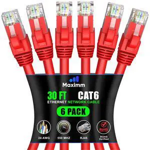 Maximm Cat 6 Ethernet Cable 30 ft (6-Pack) - High-Speed LAN Cable, Internet Cable, Patch Cable, and Network Cable - UTP, 10Gbps, 550MHz Ethernet Cord - Red