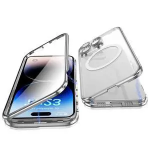 Jonwelsy Case for iPhone 14 Pro, 360 Degree Double-Sided Protection Compatible with Magsafe Magnetic Adsorption Metal Bumper Front Tempered Glass Back Frosted PC Cover for 14 Pro 6.1" (Silver)