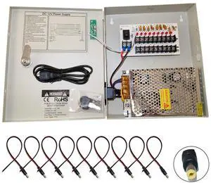 Evertech 8 Channel 9 Port Power Box Security Camera 12V DC 5A Amper CCTV DVR Power Supply Switch Box Key Locked with 9 Pcs. Male Power Jack (9 Port)