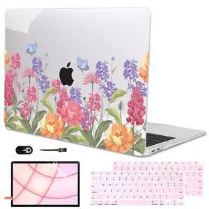 LCMOCICO for MacBook Air 13 inch M1 Case 2021 2020 2019 2018 (Model M1 A2337 A2179 A1932) with Touch ID & Retina Display, Printed Pattern Hard Shell Case Keyboard Cover, Pink & Purple Flowers