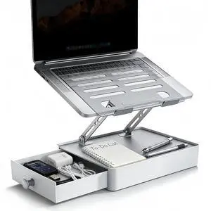 YUMFUN Laptop Stand with Storage Drawer, Heavy-Duty Metal Laptop Riser for Desk, Ergonomic Height & Angle Adjustment for 1016.2 Laptops, Silver