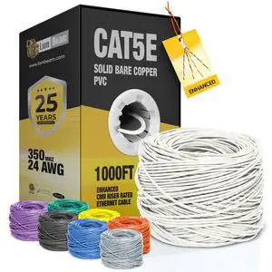 LION BEAM Solid Bare Copper Cat 5e Ethernet Cable 1000ft Pull-Box 24AWG CMR Insulated Network Cable 350 MHz Speed 1-5Gbps UTP Bulk Ethernet Riser Cable Bulk Cat 5 Ethernet Cable Spool White