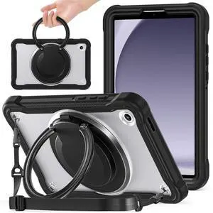 Miimall Case for Galaxy Tab A11 8.7 Inch 2025 with Shoulder Strap, Bulit-in 360 Rotating Stand, Shockproof Rugged Kids Friendly Shell Pen Holder Cover for Samsung Galaxy A11 Tablet, Black Clear