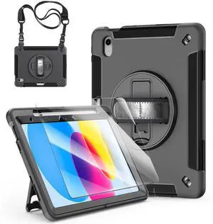 Junfire Protective Case for iPad 11th Generation (A16) 2025/ iPad 10th Gen with Screen Protector, Shockproof Rugged Case with Adjustable Hand Strap/360Rotating Stand/Stylus Holder/Carrying Strap