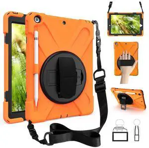 ZenRich Shockproof Case for iPad 9th/8th/7th Generation 10.2 inch 2021/2020/2019, Heavy Duty Rugged Case with Pencil Holder/360° Rotating Kickstand/Handle/Carrying Strap, Orange