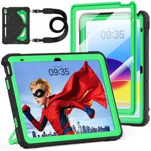Case for iPad A16 11th Generation 11 Inch 2025, Auorld for iPad 10th Generation 10.9 inch 2022 case Kids Boys with Screen Protector Foldable Stand Shoulder Strap Pencil Holder Shockproof, Black Green