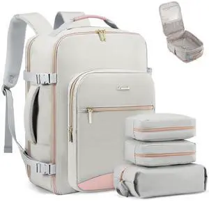 LOVEVOOK Travel Backpack for Women & Men 50L,Airline Approved Carry On Backpack Travel Essentials,TSA Carry on Luggage,Waterproof Personal Item Travel Bag,Suitcase with 3 Packing Cubes,Light gray-Pink