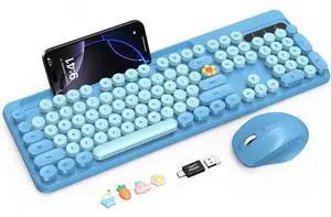Wireless Keyboard and Mouse Combo, Retro Round Keycaps, Full-Size Stylish Typewriter Keyboard with Phone/Tablet Holder, Ergonomic Mouse with 3-Level DPI, 2.4GHz Connection for Windows/PC (Sky Blue)