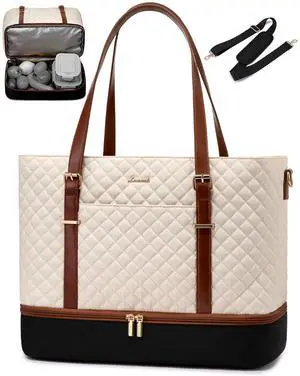 LOVEVOOK 17.3 Inch Work Tote Bag for Women, Laptop Tote Bag Gift with Computer Compartment, Leather Work Tote Computer Bag, Tote Purses Handbag Briefcase with Detachable Accessory, Beige