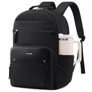 LOVEVOOK Laptop Backpack for Women with Leather Trim & Tumbler Pockets, 15.6" Work Backpack Purse, Travel Personal Item Bag, Carry On Business Computer Bag for Office, School, or Gift, Black