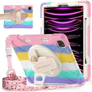 BRAECNstock Kids Case for iPad Air 11 inch (M4/M3/M2)/ Air 5th/4th Gen 10.9"/ Pro 11 inch 4th/3rd/2nd/1st Gen, Shockproof with Screen Protector, Pencil Holder, Rotating Hand Strap+Stand, Colorful Pink