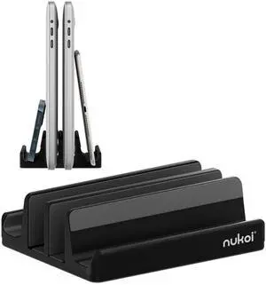 Nukoi Vertical Laptop Stand - SPACEMax Adjustable GRIPLock Anti-Tip Silicone 4 Slots Aluminum Desktop Holder - Double Dock Stand - 2 Phone Slots Fits Up to 17.3 Laptops, Tablets, Phones - Black