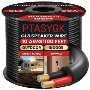 PTASYGK 10 Gague Outdoor Speaker Wire 100 Feet - 2 Conductor Direct Burial Speaker Cables CL3 CL2 Rated, UV Resistant CCA Cable for Garden, Patio, Pool Audio Systems