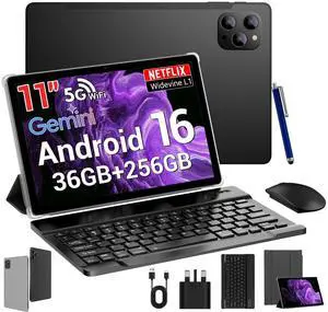 ROSYVIBE 2025 Slim 11 Inch Android 16 Tablet with Keyboard,Stylus & Mouse, 2K IPS Widevine L1, 36GB RAM 256GB (1TB TF), 8000mAh, T615 8-Core,8+13MP, 5G/2.4G WiFi, FCC/CE Certified - Black