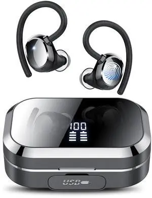 KT1 Bluetooth Headphones Wireless Earbuds 120hrs Playtime Wireless Charging Case Digital Display, Ear Buds with Earhook,IPX7 Waterproof, Deep Bass 2.0,Over-Ear Earphones for Sport Running