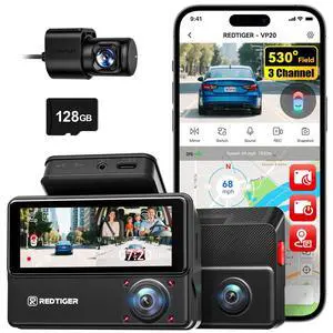 REDTIGER 530 Dash Cam 3 Channel, 2.5K+2.5K+1080P Triple Car Camera with 128GB Card, IR Night Vision, Touch Screen, Dashcam for Front Inside Rear Included WiFi GPS, 24H Parking Mode