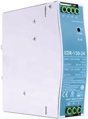 EDR-150-24 150W DIN Rail Mount Single Output 24V DC Power Supply, Metal Case, Wide Input Voltage, Short Circuit Protection, Ideal for Industrial Automation and Control Systems