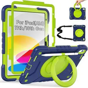 Andnary Case for iPad (A16) 11th Generation 11 inch 2025/10th Generation 10.9 inch 2022, Shockproof Cover with Screen Protector/360 Rotate Handle/Bracket/Pen Holder/Shoulder Strap (Navy+Green)
