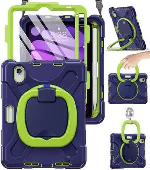 BRAECN Protective Rugged Kids Case for iPad mini 7 (A17 Pro) 2024 / iPad mini 7th/6th Generation 2021-8.3 Inch w/Screen Protector, Pencil Holder, Handle Grip, Kickstand, Shoulder Strap, Navy Green